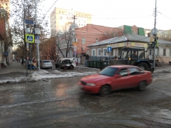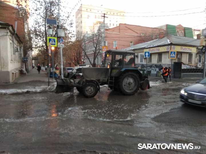 Сегодня утром произошла коммунальная авария в центре Саратова. На перекрестке улиц Соборная и Первомайская порвались подземные коммуникации. Из люка на проезжей части выливаются потоки воды. Жидкость немедленно замерзает и образует неровную корку на асфальте.