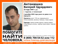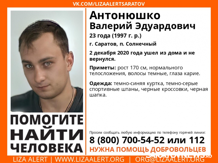 Пропал 23-летний Валерий Антонюшко из поселка Солнечный. 2 декабря 2020 года он вышел из дома и не вернулся. Рост пропавшего составляет 170 сантиметров, он нормального телосложения, имеет темные волосы и карие глаза.