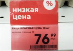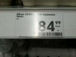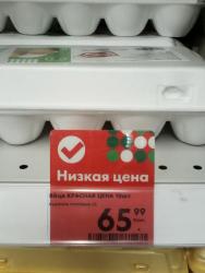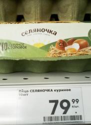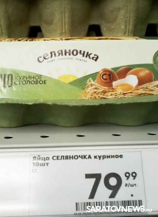 В саратовских «Пятерочках» было обнаружено куриное яйцо стоимостью 84 рубля 99 копеек (отборное). По акции продукт «Красная цена» (собственная марка, отборное) – 76 рублей 99 копеек за десяток. Впрочем, первый сорт фермерского хозяйства «Селяночка» не сильно отличился по цене – 79 рублей 99 копеек. Более мелкие яйца второго сорта продаются в «Пятерочке» как акционный товар (красный ценник «Низкая цена», собственная марка), стоимость 65 рублей 99 копеек.