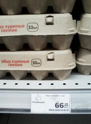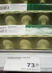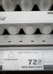 В сети «Магнит» цены ниже, но тоже потихоньку растут. Отборное яйцо (производитель «Симоновская птицефабрика») – 73 рубля 99 копеек. По акции магазина (72 рубля 79 копеек) продается отборка, первый сорт (также по акции) – 66 рублей 29 копеек.