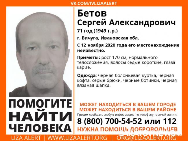 Рост пропавшего составляет 170 сантиметров, у него нормальное телосложение, карие глаза и седые волосы. В день исчезновения на Сергее Бетове была черная болоньевая куртка, черная кофта, серые брюки, черные ботинки и черная вязаная шапка.