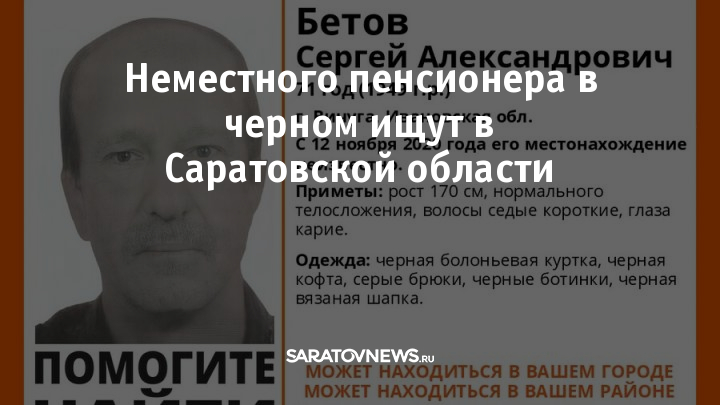 В Саратовской области может находиться пропавший 71-летний Сергей Бетов из села Вичуга в Ивановской области. С 12 ноября 2020 года его местонахождение неизвестно.