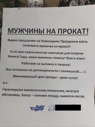 Некие предприимчивые граждане решили найти себе женскую компанию и праздничный стол к Новому году. По городу расклеивают объявления «Мужчины напрокат». В обмен на выпивку и закуску саратовчанкам предлагают пригласить к себе молодых людей на праздники. Те обещают скрасить досуг, а также вымыть за собой посуду и вынести мусор.