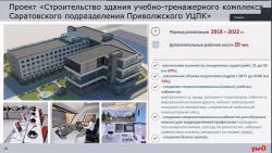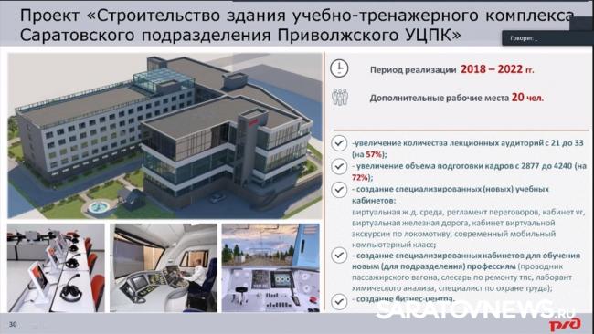 К 2022 году должно быть завершено строительство здания учебно-тренажерного комплекса Саратовского подразделения Приволжского УЦПК, которое началось в 2018 году. Новый центр даст работу 20 сотрудникам и позволит увеличить скорость подготовки кадров на 72 процента. Он будет обеспечен самыми высокотехнологичными специализированными кабинетами для обучения самым разнообразным железнодорожным профессиям, таким как проводник пассажирского состава, лаборант химического анализа, слесарь по ремонту ТПС и т.д. Комплекс включает также современный бизнес-центр.