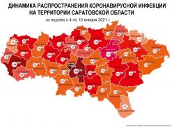 Сегодня, 11 января, была опубликована карта распространения случаев коронавируса за неделю с 4 по 10 января 2021 года. Новые случаи распределились по муниципалитетам Саратовской области следующим образом: