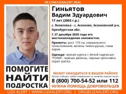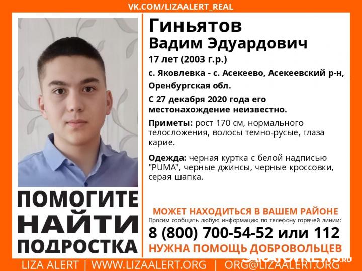 Пропал 17-летний Вадим Гиньятов, проживающий в селе Яковлевка Алексеевского района Оренбургской области. С 27 декабря 2020 года его местонахождение неизвестно.