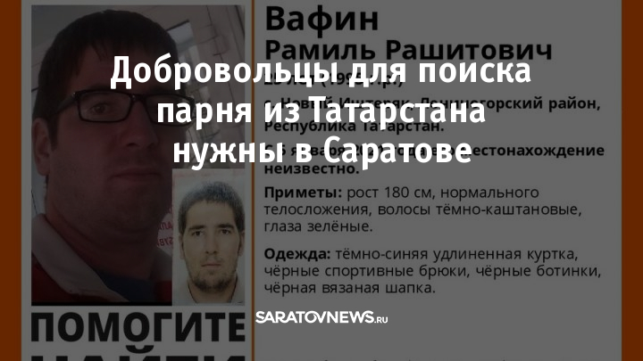 Вчера, 18 января, появилась информация о том, что для поисков пропавшего жителя Татарстана нужны добровольцы в Саратове. Об этом проинформировала группа «Лиза Алерт» в социальной сети.
