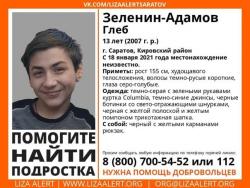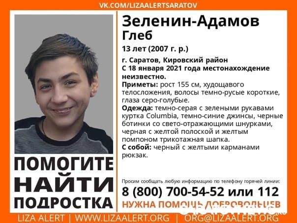 13-летний Глеб Зеленин-Адамов пропал 18 января 2021 года. Он ушел из дома в Кировском районе Саратова и не вернулся.