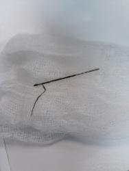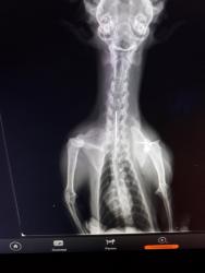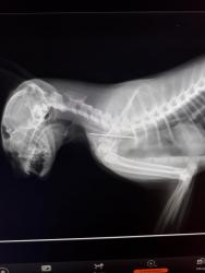 В ветеринарную лечебницу № 1 обратилась женщина, чья кошка сильно кашляла. По словам хозяйки, животное прошло курс лечения в другой клинике по поводу бронхопневмонии, но так и не выздоровела. В ходе диагностики был сделан снимок, на котором было ясно видно, что в мягких тканях шейно-грудного отдела между пищеводом и трахеей находилась игла.