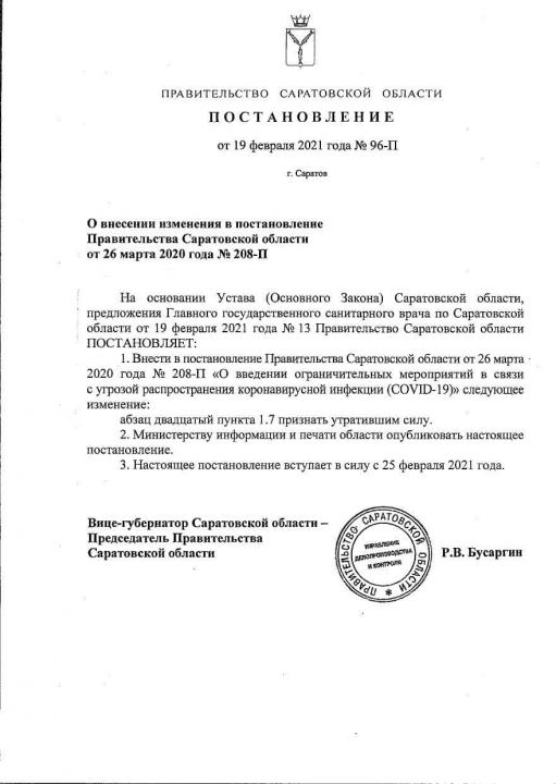 В следующий четверг, 25 февраля, в Саратовской области отменяются ограничительные меры в учреждениях общепита, введенные ранее из-за коронавируса. Об этом говорится в постановлении вице-губернатора Романа Бусаргина, опубликованном сегодня, 19 февраля.