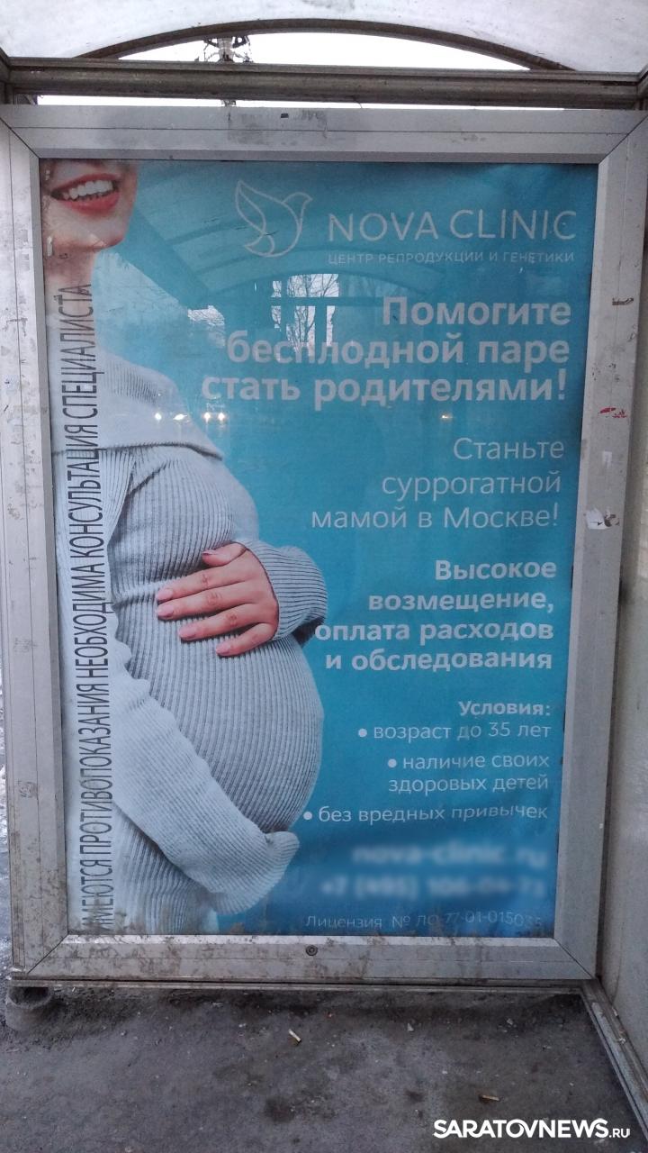 В Саратове на остановках общественного транспорта появилась реклама с призывом стать суррогатными матерями в столице. Рекламные плакаты в остановочные павильоны поместило МУП «Городской центр размещения рекламы». Муниципальное предприятие рекламирует столичный центр репродукции и генетики, в чей набор услуг входит и суррогатное материнство. "Станьте суррогатной мамой в Москве!", - в повелительной форме обращаются к живому товару Саратова. "Суррогатные мамы, которых мы подбираем, полностью соответствуют всем требованиям, содержащимся в соответствующем приказе Минздрава РФ", - информирует сайт столичной клиники.