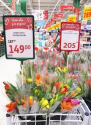 В то время, когда в цветочных магазинах и на рынках Саратова тюльпаны продаются по 70-90 рублей штука (стоимость зависит от сорта: длины стебля, времени, которое проходит от срезки тюльпанов – совсем закрытый бутон, как правило, самый дешевый), сетевые магазины областного центра приобрели первые весенние цветы и отдают их по прошлогодней цене.