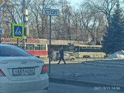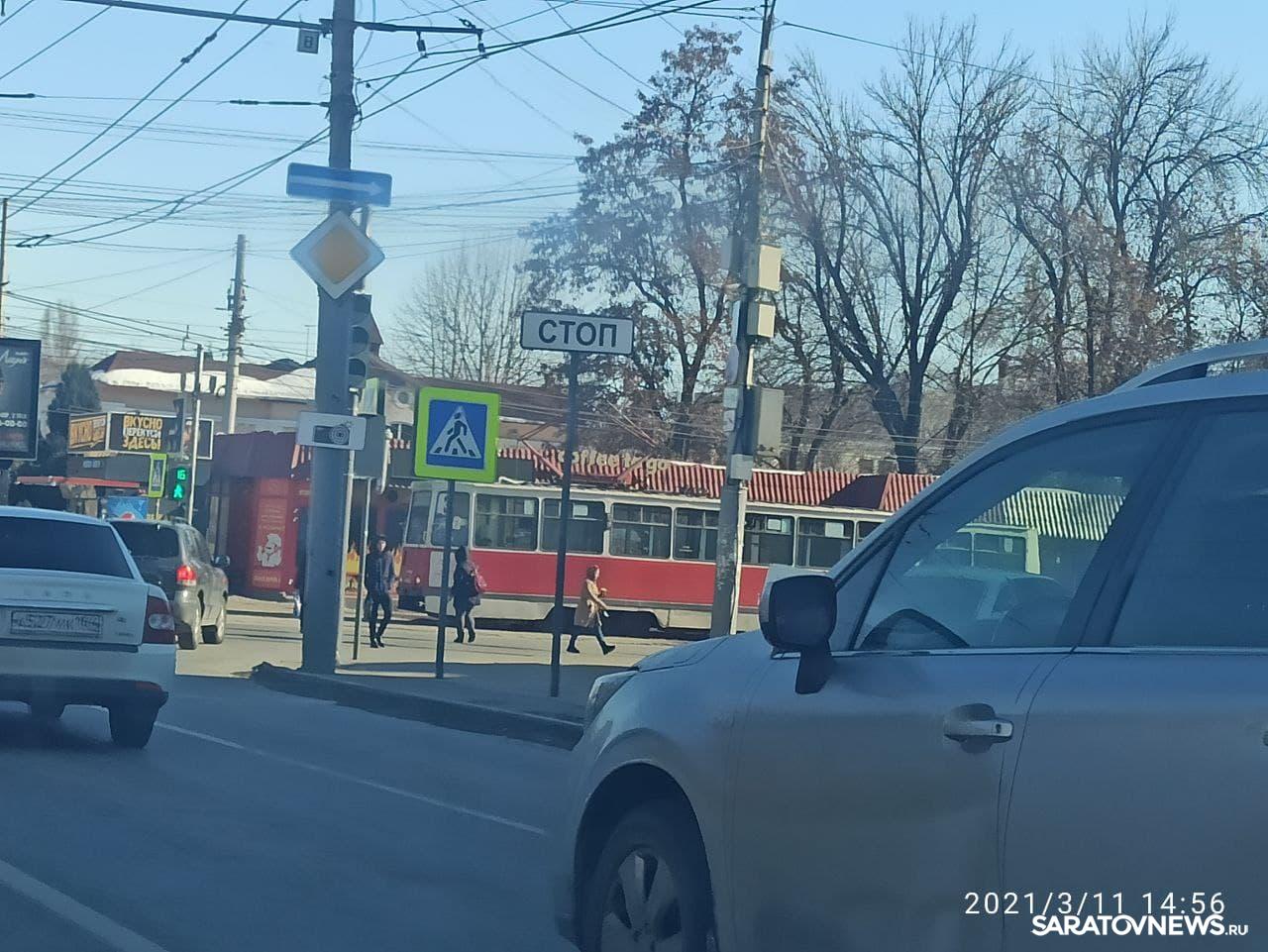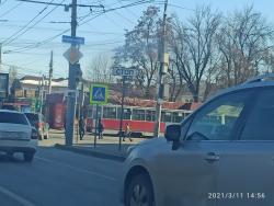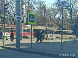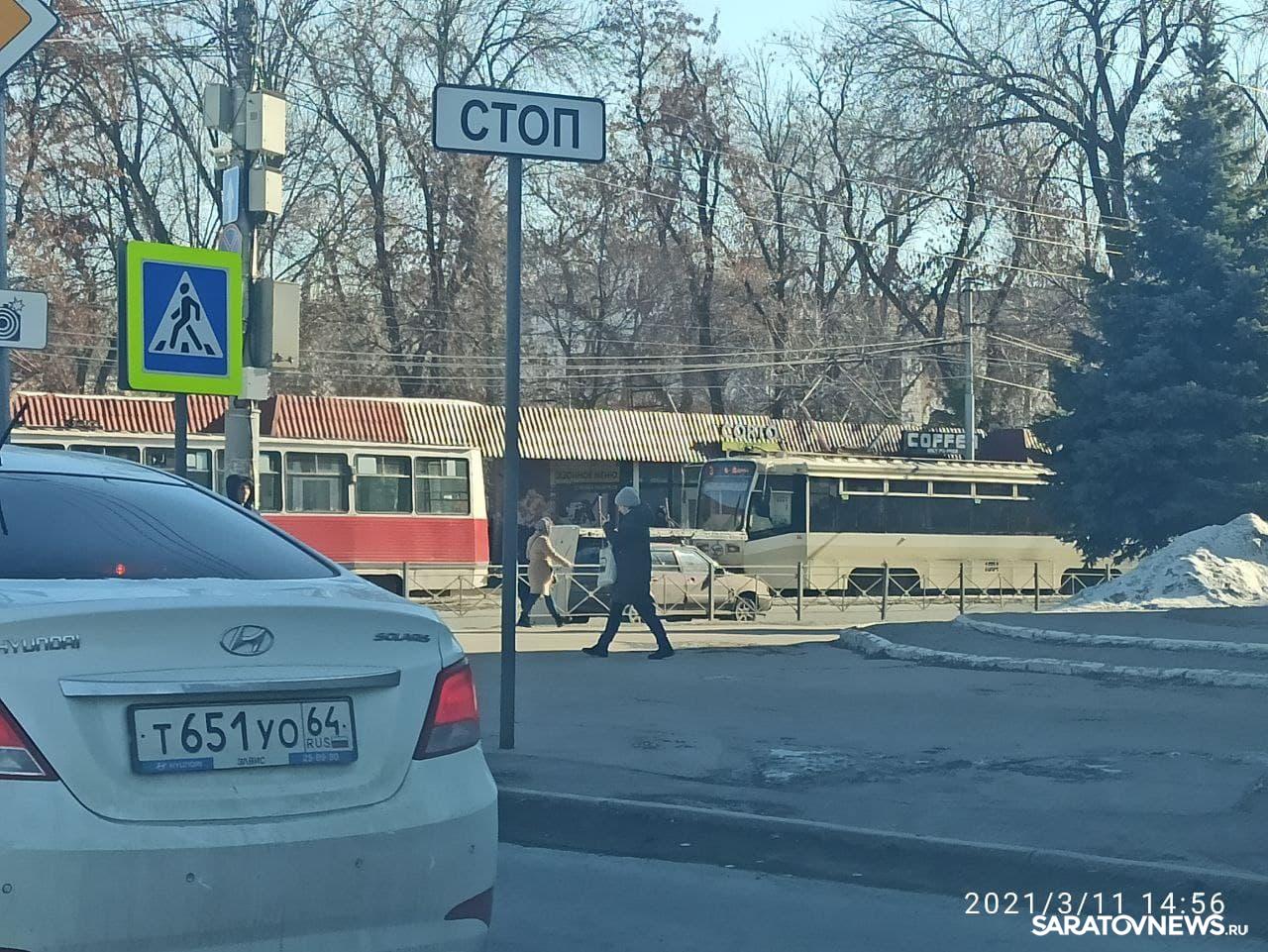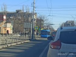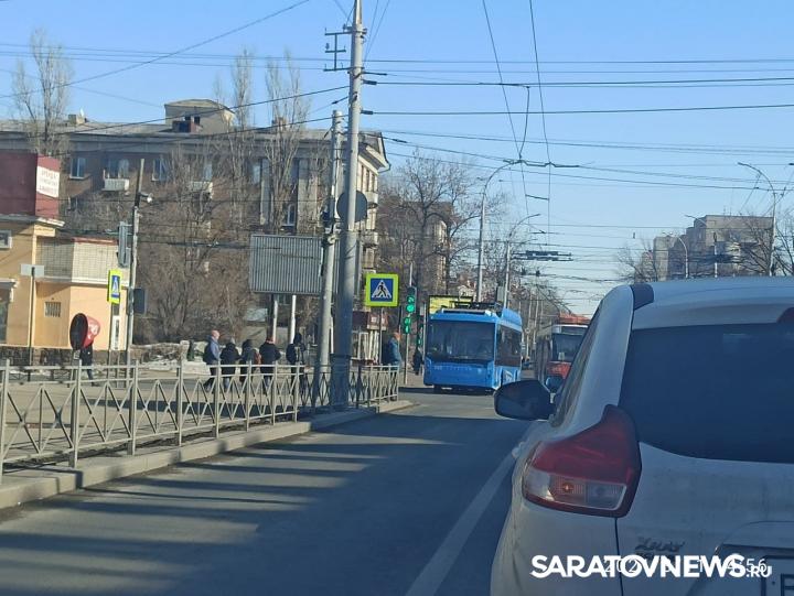 В эти минуты на пересечении улиц Московской и Астраханской в Саратове стоит неисправный троллейбус. Он встал прямо на трамвайных путях. Таким образом, троллейбус перегородил движение трамваев № 3 и 11. Вагоны выстроились друг за другом на улице Астраханской.