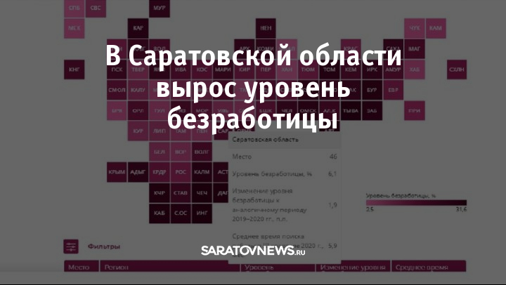 Саратовская область разместились на 46 месте в списке из 85 субъектов РФ. Уровень безработицы в Саратовской области, согласно представленным данным, равен 6,1%. Относительно аналогичного периода прошлого года он увеличился на 1,9 процента. Среднее время поиска работы в III квартале 2020 года составило 5,9 месяцев.