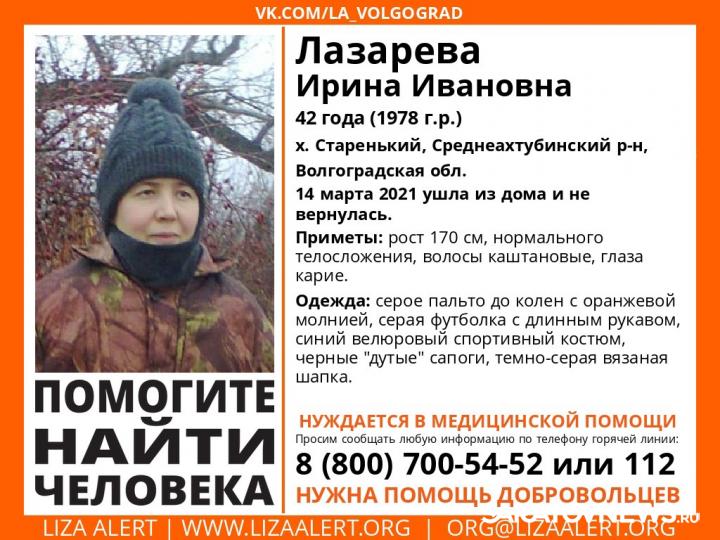 Пропала 42-летняя Ирина Лазарева, проживающая на хуторе Старенький, Среднеахтубинского района, Волгоградской области. 14 марта 2021 ушла из дома и не вернулась.
