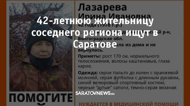 Сегодня, 16 марта, волонтеры «Лиза Алерт» рассказали о том, что на территории Саратовской области разыскивается пропавшая жительница Волгоградской области.