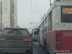В районе пересечения улиц Чернышевского и 2-й Садовой отключилась троллейбусная линия. По-видимому, не работает она уже давно, потому что троллейбусов скопилось много. Произошел ли обрыв линии ― неизвестно.