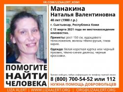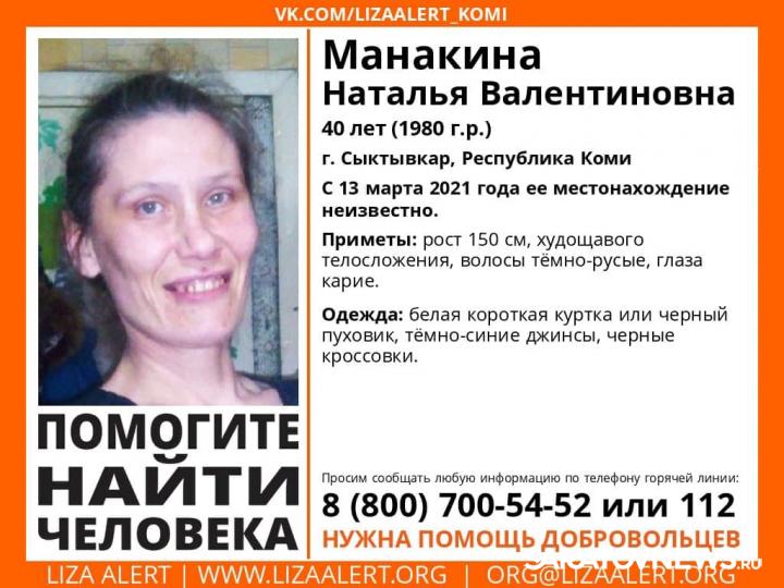 Пропала 40-летняя Наталья Манакина, проживающая в Сыктывкаре, в республике Коми. С 13 марта 2021 года ее местонахождение неизвестно. Рост пропавшей составляет примерно 150 сантиметров, она худощавого телосложения, имеет карие глаза и темно-русые волосы. В день исчезновения на ней была белая короткая куртка или черный пуховик, темно-синие джинсы и черные кроссовки.