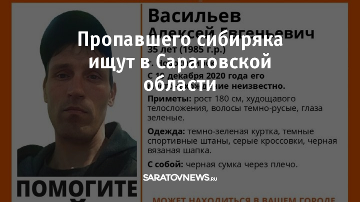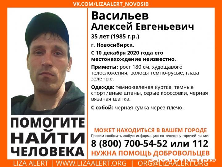 Пропал 35-летний Алексей Васильев из Новосибирска. С 10 декабря 2020 года его местонахождение неизвестно. Рост пропавшего 180 сантиметров, он худощавого телосложения, имеет темно-русые волосы и зеленые глаза. В день исчезновения на нем были темно-зеленая куртка, темные спортивные штаны, серные кроссовки и черная вязаная шапка.