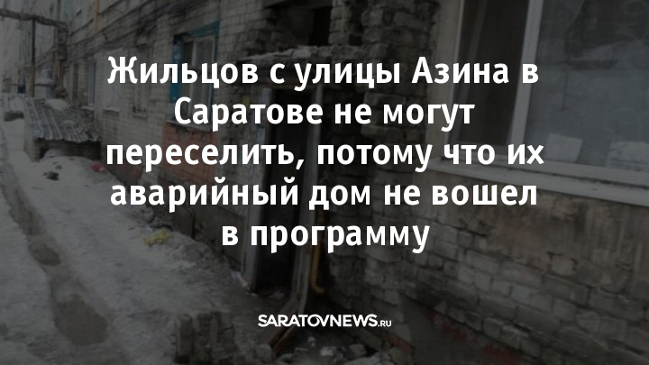 Администрация Заводского района Саратова откликнулась на нашу публикацию об ужасных условиях в доме № 75 по улице Азина и сообщила, что данный дом признан аварийным и подлежащим сносу распоряжением администрации муниципального образования «Город Саратов» от 30.10.2018 № 416-р.