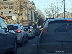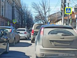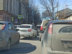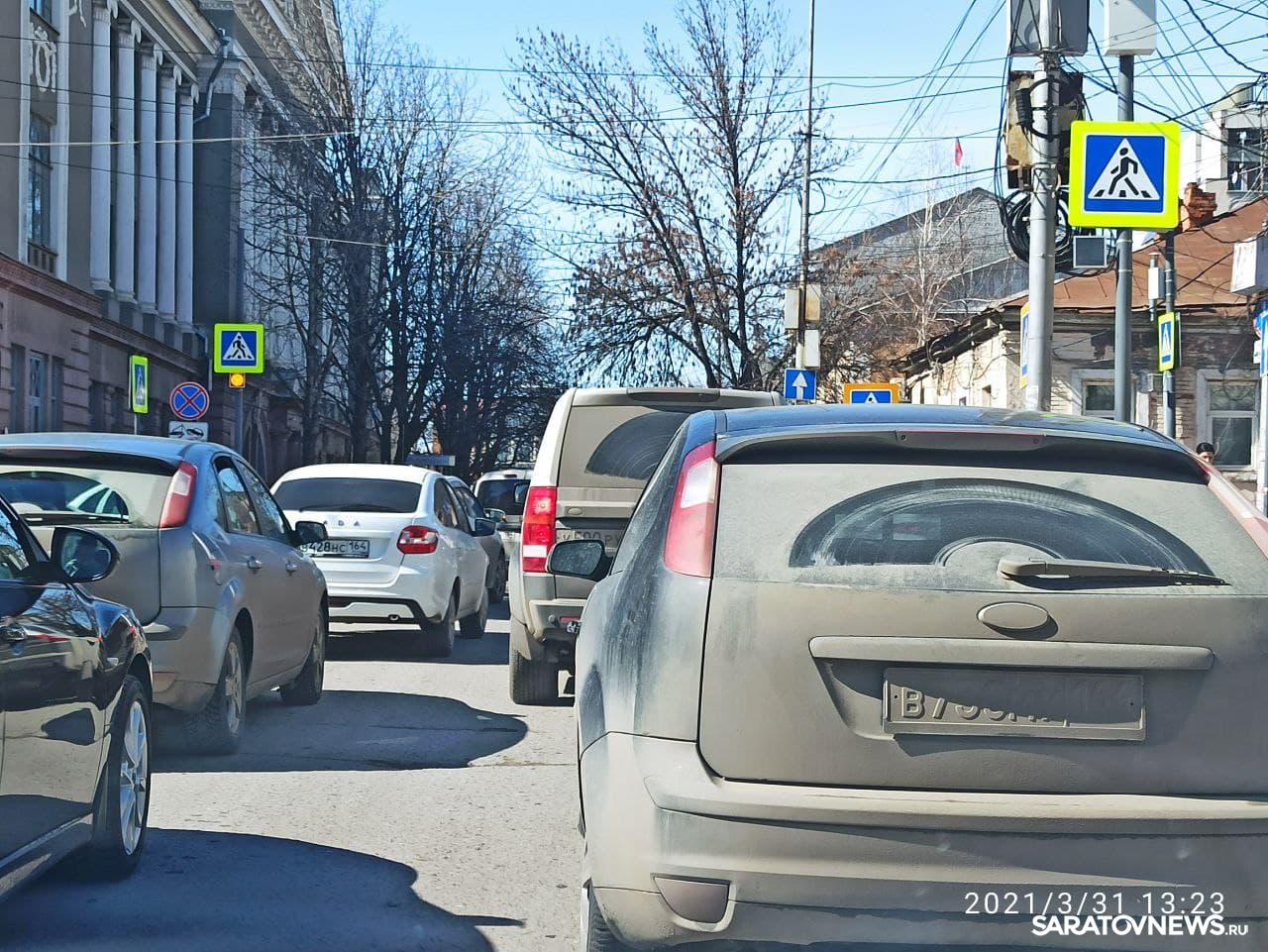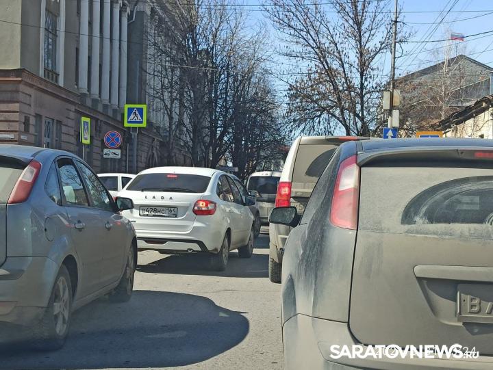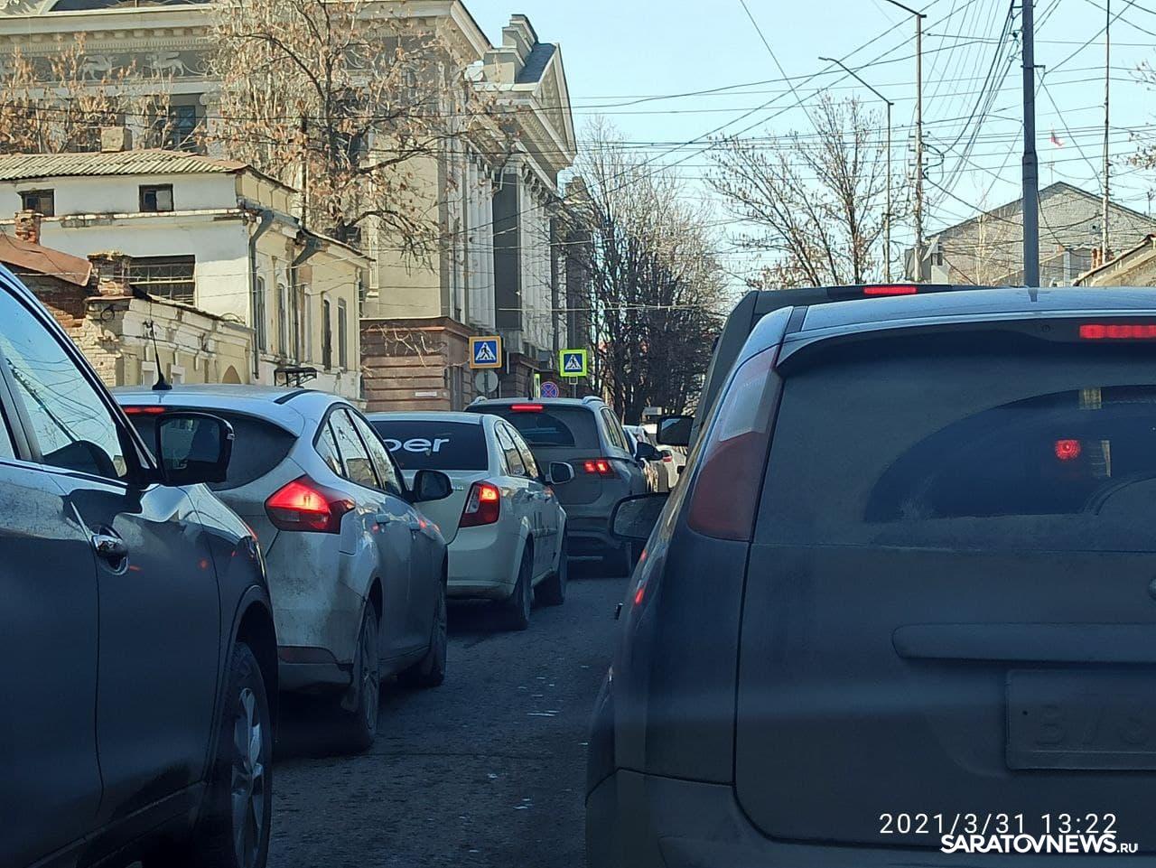 В эти минуты в центре Саратова сотрудники ГИБДД перекрыли улицу Первомайскую от Соборной до Радищева. На этом участке образовалась серьезная пробка. По словам водителей, объехать ее можно только по Соборной.