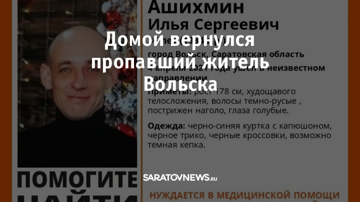 Нашелся живым 36-летний Илья Ашихмин из Вольска. Его местонахождение было неизвестно с 4 апреля. Сообщалось, что он нуждается в медицинской помощи. Вчера он благополучно вернулся домой.