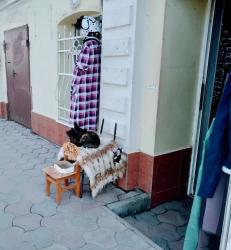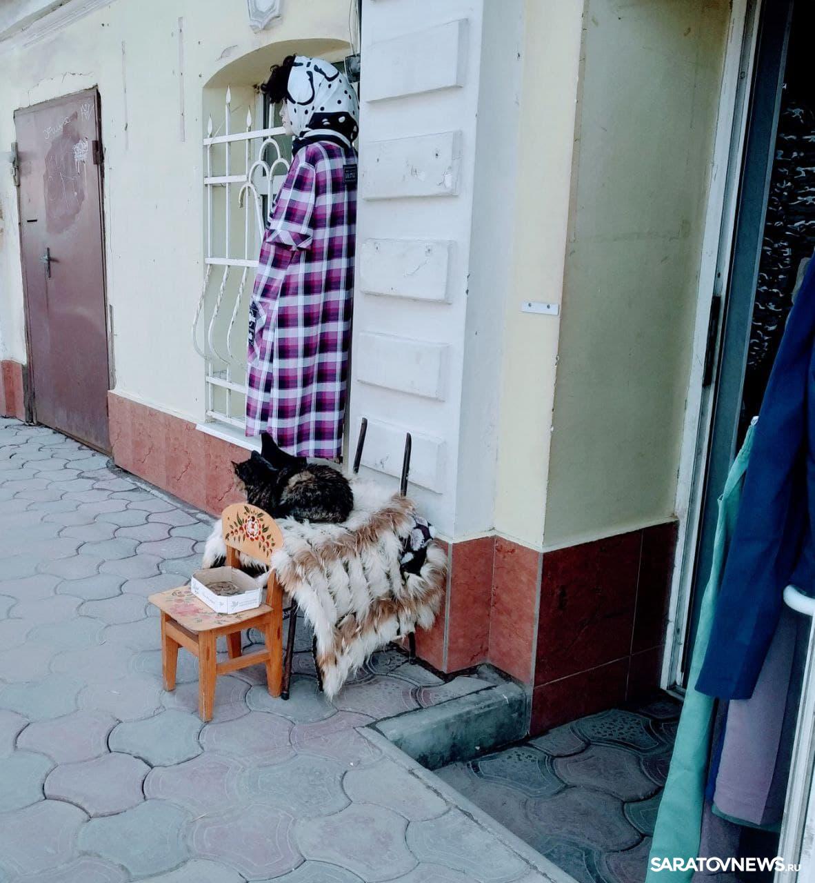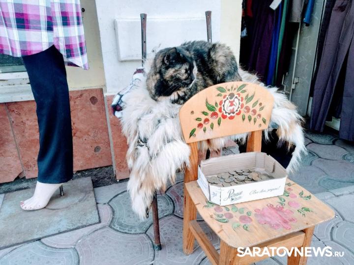 У одного из магазинчиков в Саратове на улице Чернышевского в эти теплые дни появилась кошка. Она сидит на стульчике на меховой подстилке и просто «торгует» своим милым видом. Рядом с ней стоит еще один стул с коробкой для монет.