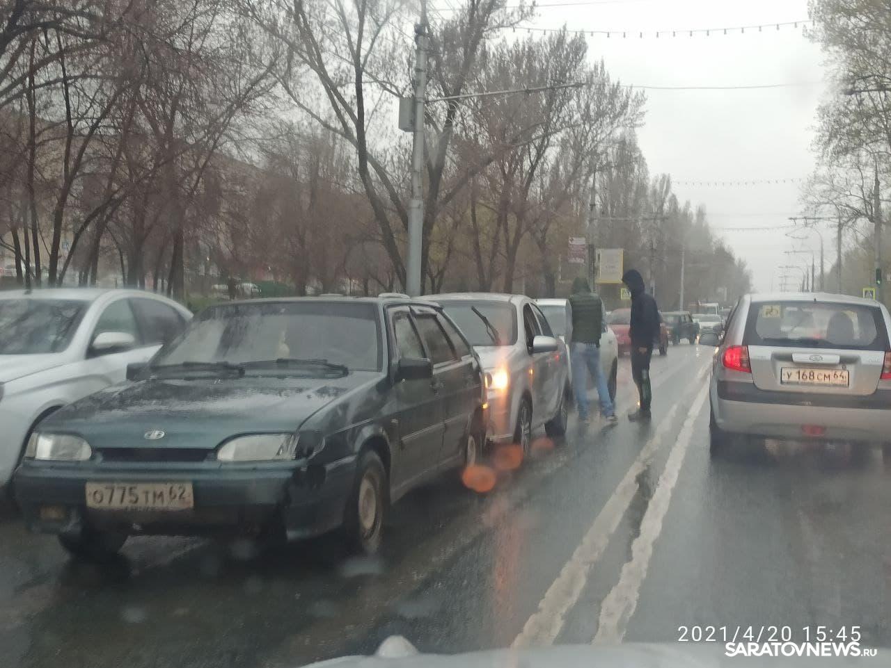 Сегодня, 20 апреля, в Кировском районе Саратова произошло ДТП с участием трех автомобилей. На проспекте 50 лет Октября в сторону «Стрелки» столкнулись «Лада», «ВАЗ-2114» и Hyundai. В результате аварии перекрылась одна дорожная полоса, образовался затор, затруднилось движение в сторону центра города. Ситауция еще осложняется непростыми погодными условиями: на дороге хлещет дождь.