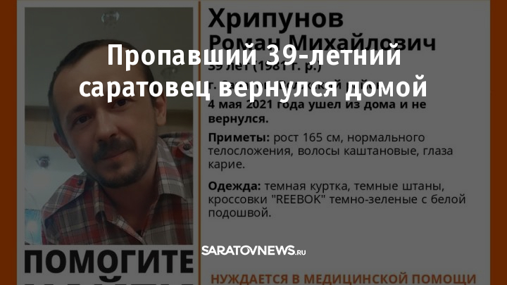 Сегодня, 8 мая, волонтеры саратовского отделения «Лиза Алерт» рассказали о том, что 39-летний пропавший ранее саратовец вернулся домой. Сообщение размещено на странице активистов в социальной сети.