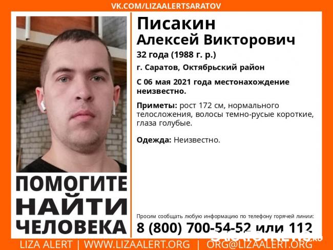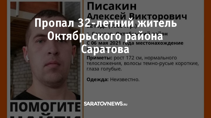 Пропал 32летний Алексей Писакин, проживающий в Октябрьском районе Саратова. Дата пропажи саратовца 6 мая 2021 года, с тех пор его местонахождение неизвестно. Рост пропавшего составляет 172 сантиметра, у него нормальное телосложение, темно-русые и короткие волосы, голубые глаза. Его одежда в день исчезновения неизвестна.