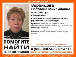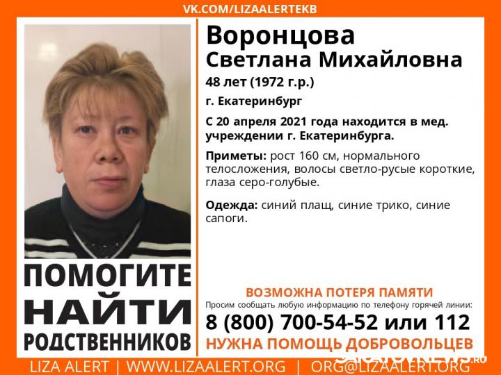 Волонтеры просят помочь найти родственников 48-летней Светланы Михайловны Воронцовой, что сейчас находится в одном из медицинских учреждений Екатеринбурга. Она пребывает там с 20 апреля 2021 года.