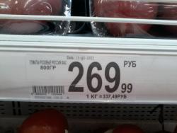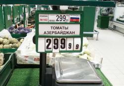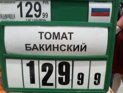 Зато в гипермаркете «Ашан» были обнаружены расфасованные по 400 г помидоры стоимостью 129,9 рублей за упаковку на подложке, или 324,9 рубля за кг («томат бакинский» производства России). Крупные розовые помидоры производства Азербайджана, которые на рынках областного центра стоят, в среднем, 200 - 220 рублей за кг, гипермаркет предлагает по 299 рублей 99 копеек за кило. 337 рублей кило стоят томаты розовые, фасованные (упаковка – 800 г, соответственно ее цена - 269,9 рублей кг).