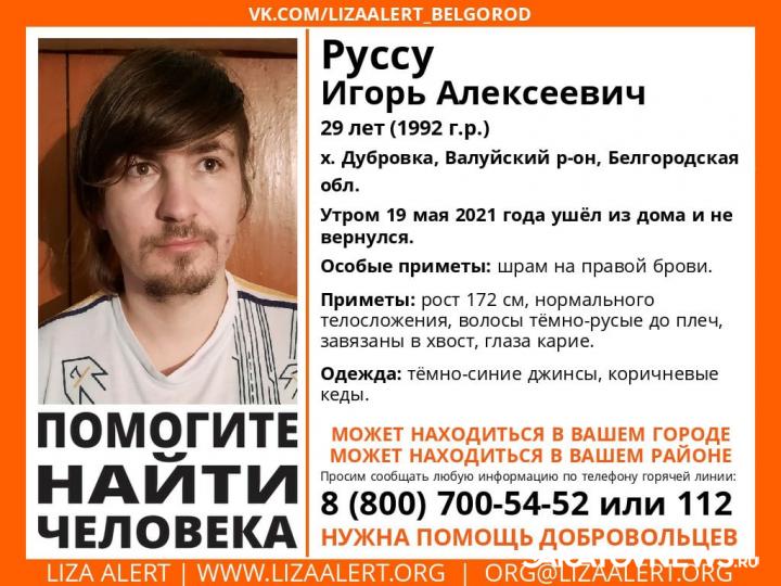 Пропал 29-летний Игорь Русс, проживающий на хуторе Дубровка, Валуйского района, Белгородской области. Утром 19 мая 2021 года ушёл из дома и не вернулся. Рост пропавшего составляет 172 сантиметра, он нормального телосложения, имеет темно-русые волосы до плеч, завязанные в хвост и карие глаза.