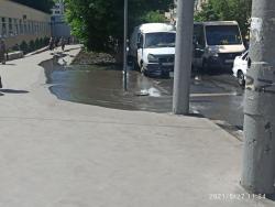 Около детской городской поликлиники в Саратове сегодня, 27 мая, настоящий потоп. На перекрестке Чапаева и Бахметьевской из колодца сильным потоком хлещет холодная вода. Она заливает тротуар и проезжую часть.