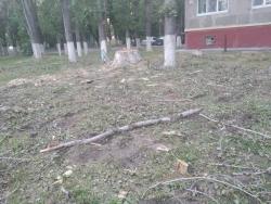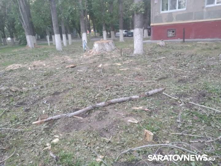 Саратовцы поделились с редакцией ИА SaratovNews кадрами свежей вырубки. У дома теперь красуются огромный пень, две лысых «мачты» вместо тополей, а также разбросанные ветки и фрагменты стволов.