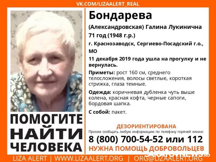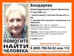 Пропала 71-летняя Галина Бондарева (Александровская), проживающая в Краснозаводске, Сергиево-Посадского округа в Московской области. С 11 декабря 2019 года ее местонахождение неизвестно.