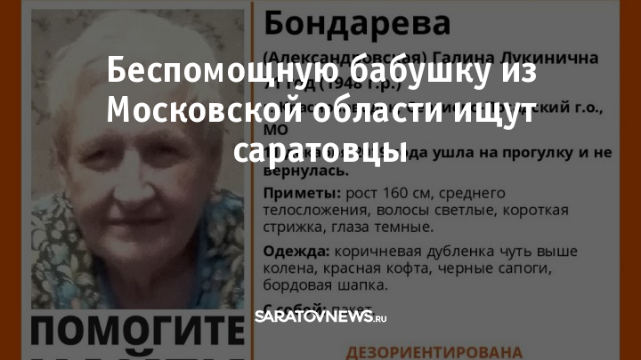 Сегодня утром, 31 мая, волонтеры саратовского отделения «Лиза Алерт» обратились к жителям региона с просьбой поучаствовать в поисках пропавшей пенсионерки.