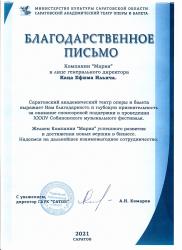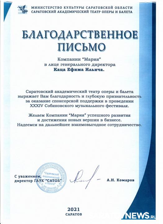Директор учреждения Алексей Комаров направил в компанию «Мария» официальное письмо, в котором выразил признательность за помощь в проведении XXXIV Собиновского музыкального фестиваля, а также пожелал ее сотрудникам успешного развития и достижения новых вершин.