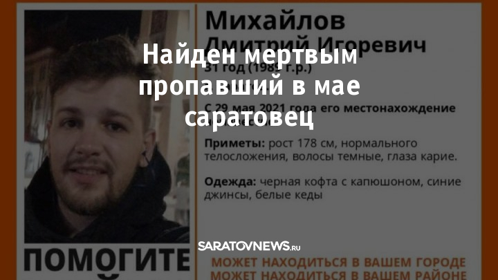 Найден погибшим 31-летний Дмитрий Михайлов. Напомним, он был в розыске с 29 мая 2021 года.