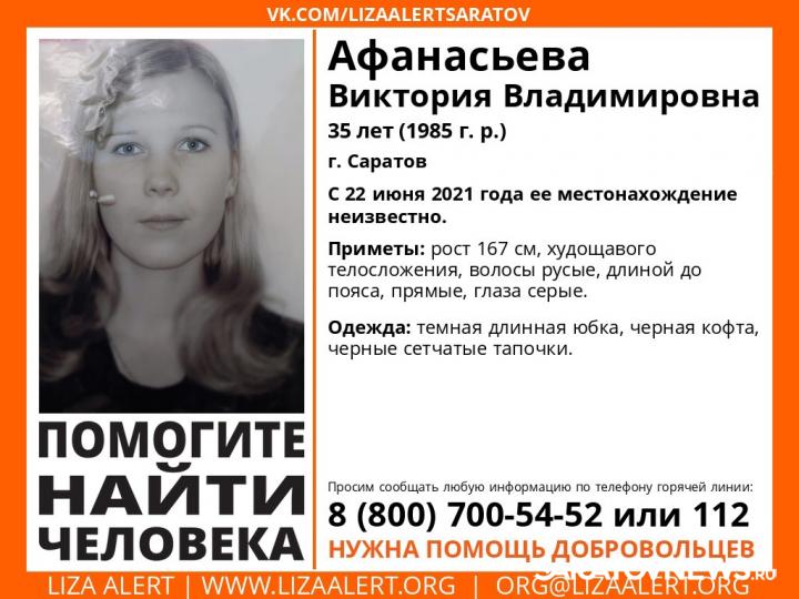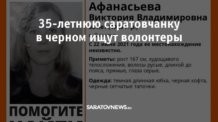 Пропала 35-летняя Виктория Афанасьева. Ее ищут с 22 июня 2021 года. Рост пропавшей составляет 167 сантиметров, она худощавого телосложения, имеет прямые русые волосы длиной до пояса и серые глаза. В день исчезновения на ней была черная кофта, темная длинная юбка и черные сетчатые тапочки.