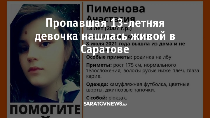Живой найдена 13-летняя Анастасия Пименова. Ее не было дома с 8 июля 2021. Напомним, девочка ушла из дома и не вернулась.