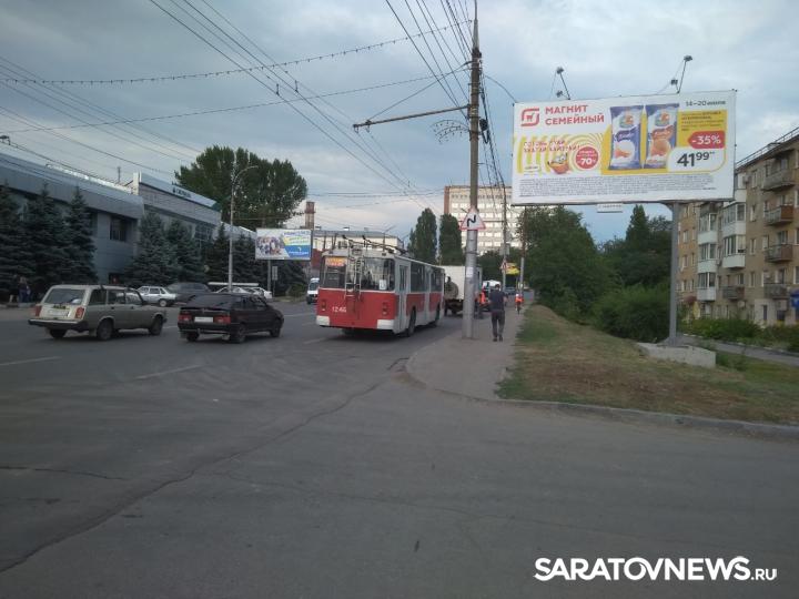 У путепровода стоят троллейбусы, их движение приостановлено из-за повреждения контактной сети.