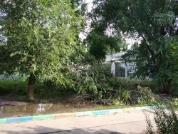 В Заводском районе Саратова на улице Ново-Астраханской, 36 в глубокой луже лежат поваленные ветви кленов. Часть оторванных веток жильцы уже сгрудили в общую кучу.