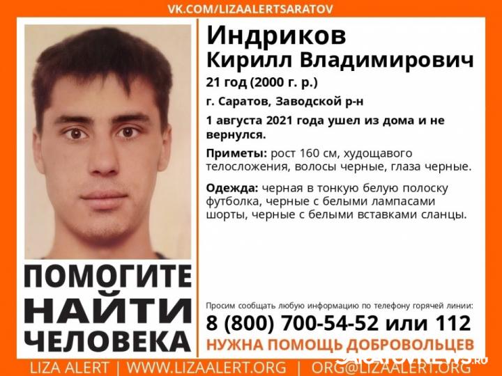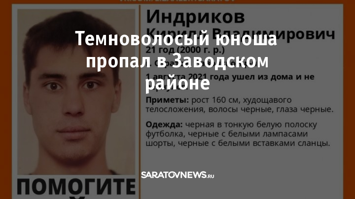 Пропал 21-летний Кирилл Индриков, его ищут с 1го августа. Рост пропавшего составляет 160 сантиметров, он худощавого телосложения, имеет черные волосы и карие глаза.