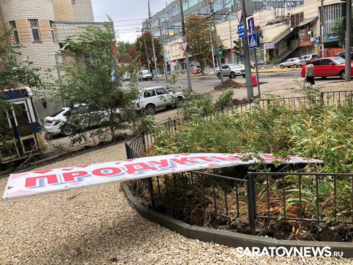 Сегодня, 3 сентября, в 13:22 из-за сильного порыва ветра снесло железную вывеску «Продукты» на улице Чернышевского в Волжском районе Саратова. Известно, что никто не пострадал.