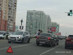 В результате удара машины заняли левый ряд. Авария затруднила движение транспорта в сторону выезда из города, образовался затор. Сотрудники ГИБДД еще не прибыли к месту ДТП.
