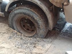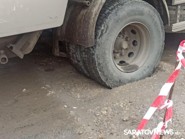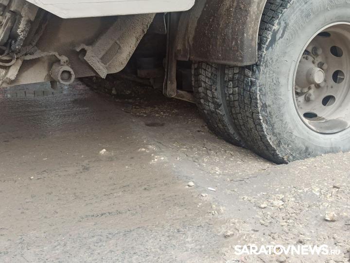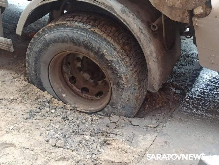 Водитель объезжал место ремонтных работ в сторону Горького, но колесо грузовика угодило в яму, мусоровоз застрял и не может выехать. Машину пытался вытащить с помощью троса грузовик MAN – не получилось. Об этом рассказал корреспонденту ИА SaratovNews сам уставший от приключений водитель.