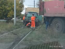 Вагоны не ходили в обе стороны из-за повреждения трамвайных путей. На месте работала аварийная служба. Рабочие вели сварку. Сейчас движение трамваев восстановлено.
