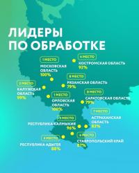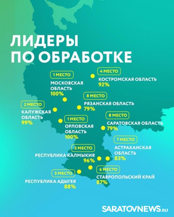 Первое место, где все 100% отходов направляются на обработку, разделили между собой Московская и Орловская области, второе у Калужской области. Саратовская область с долей обработки более 79% отнесена на восьмое место в десятке лучших.