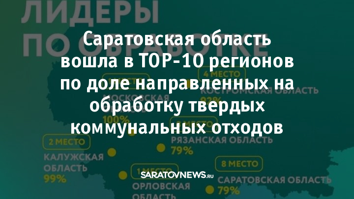«Саратовская область не первый раз попадает в рейтинги, которые формируют специалисты Российского экологического оператора. Впервые в число лучших мы вошли за нашу просветительскую программу и качество работы с органами местного самоуправления и общественными организациями. Что касается доли обработки коммунальных отходов, то на наших заводах в Энгельсе и Балакове она уже достигает 100%. Показатель под 80% сформирован в целом по региону, и вырастет до 100%, когда в Правобережье будет построен еще один мусоросортировочный комплекс», - рассказал директор Саратовского регоператора АО «Ситиматик» Михаил Андреев.
